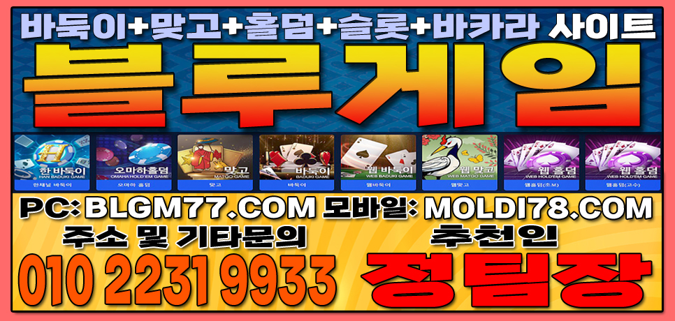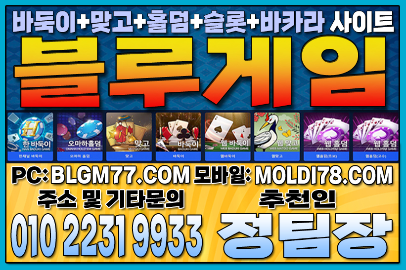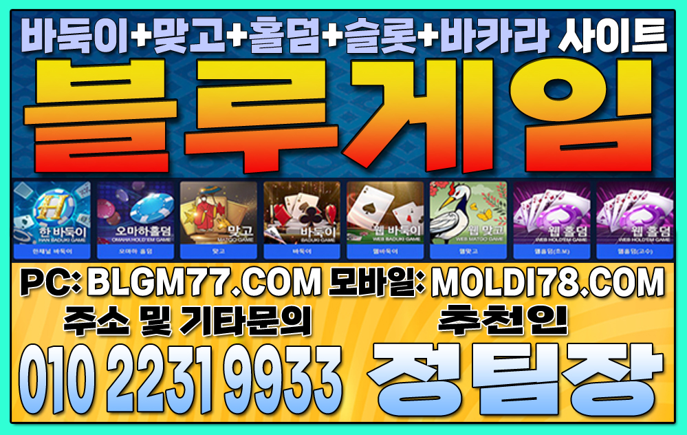 지금 바로 블루게임(바둑이,맞고,홀덤,슬롯,바카라)에서 검증된 온라인 게임을 시작하세요!정기적인 업데이트와 최신 정보 안내를 통해 항상 신뢰할 수 있는 서비스를 제공합니다. 소액 및 고액 금액에 관계없이 모두가 공평한 대우를 받으며, 타 업체 대비 높은 수익률을 기대할 수 있습니다. 최신 정보 안내 및 기타 문의 010-2231-9933 가입추천:정팀장 텔레: jtj007
